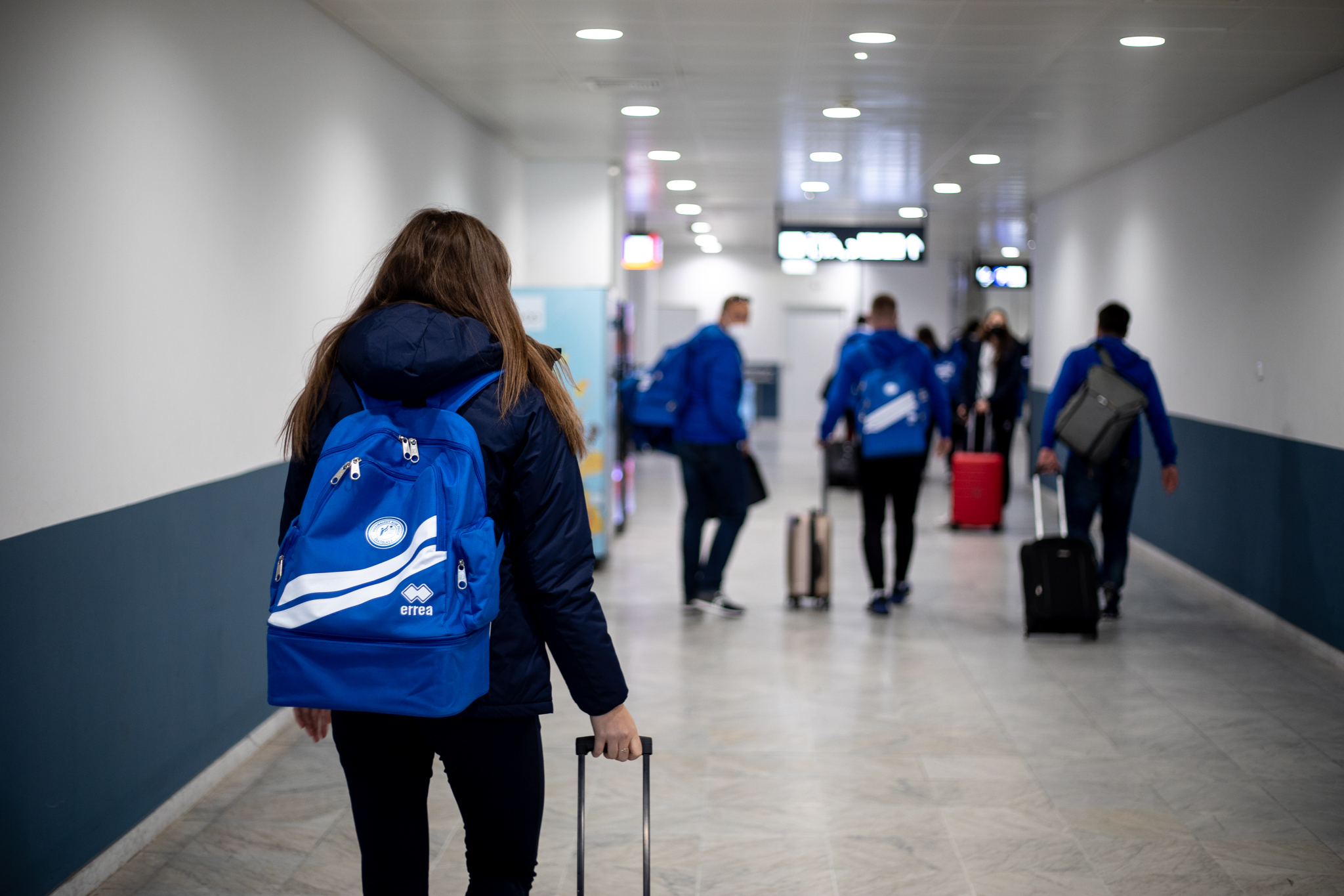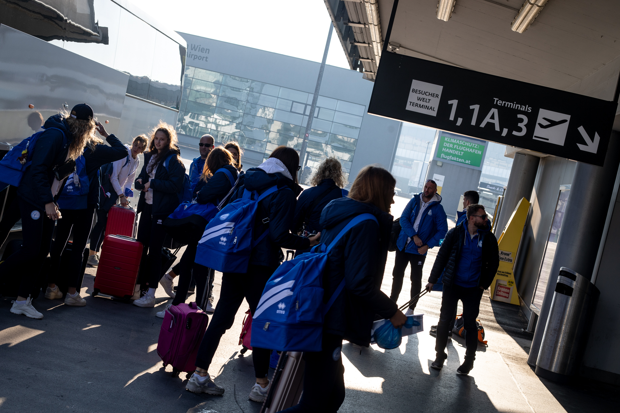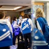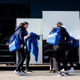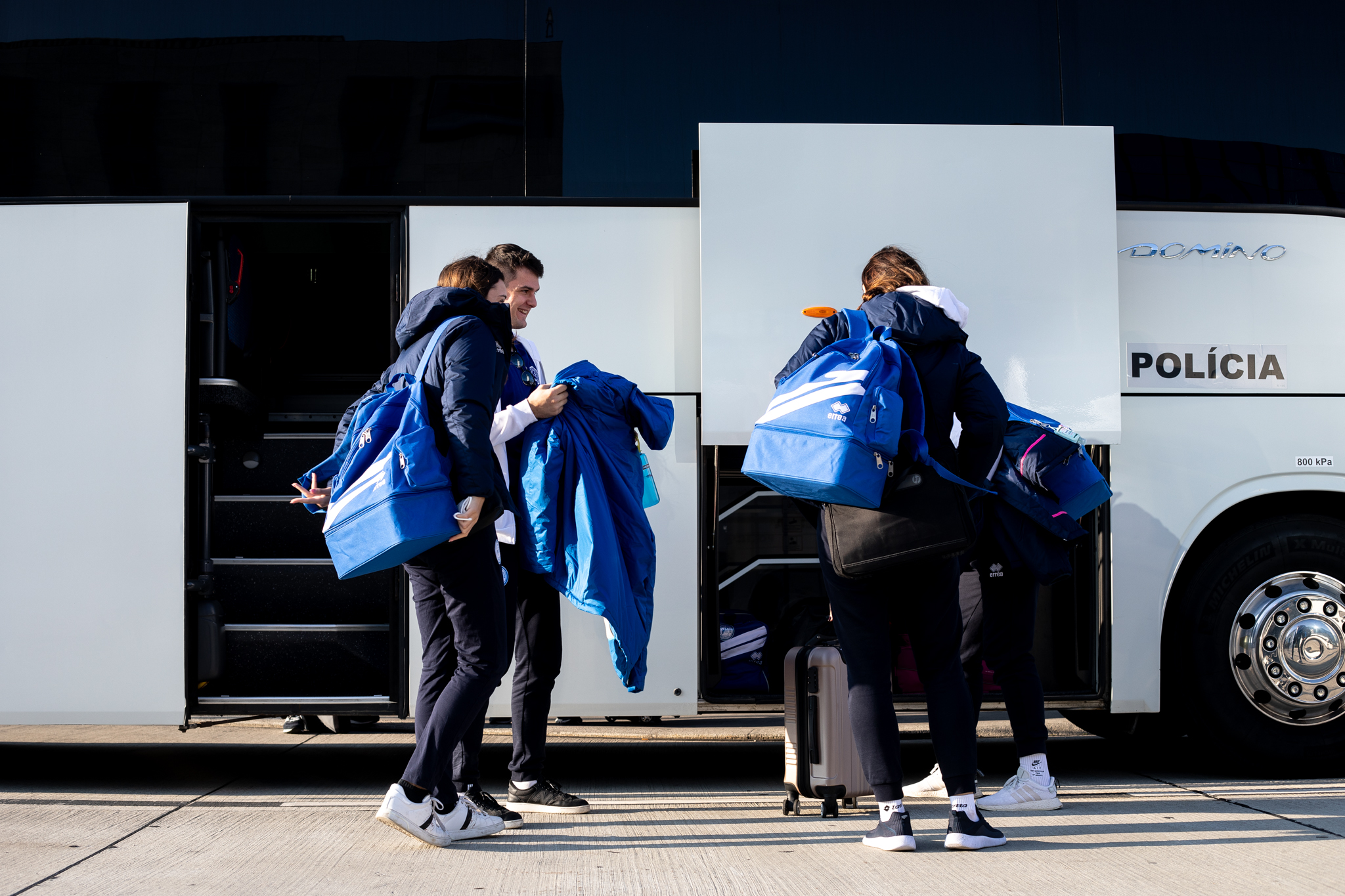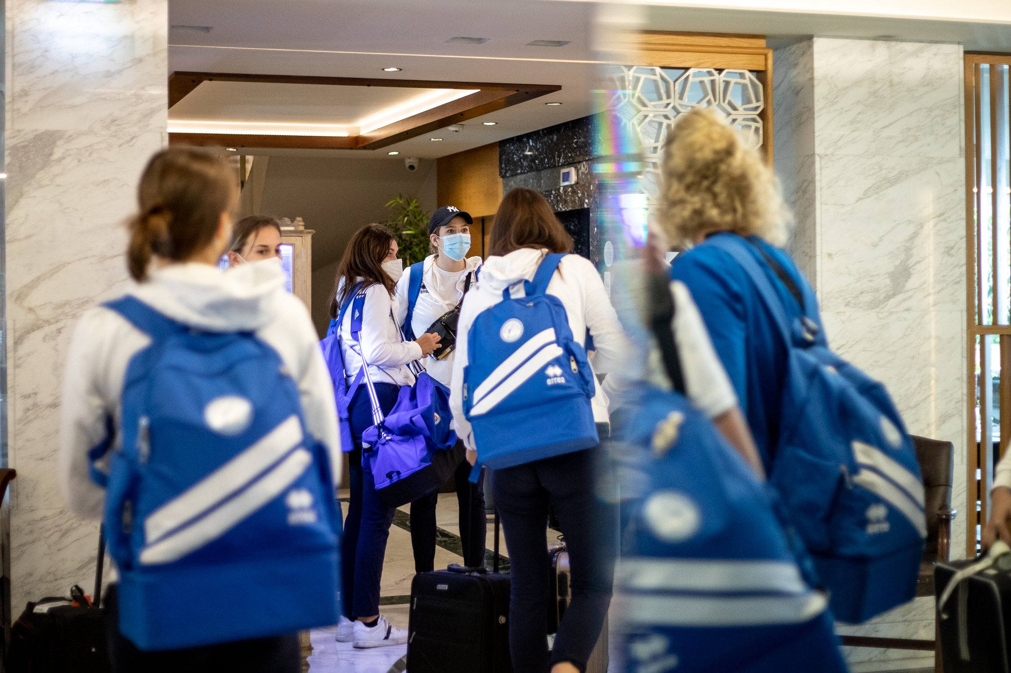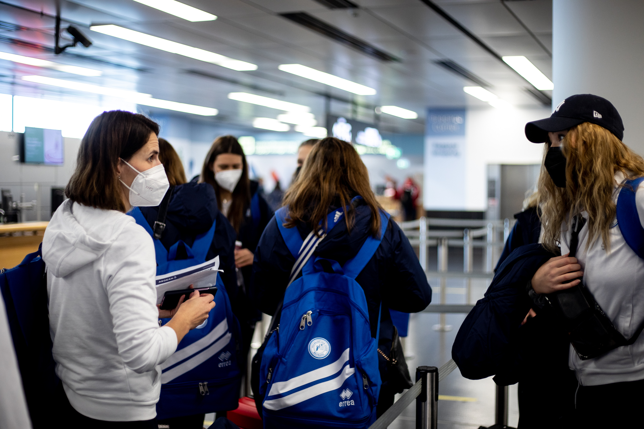 Výprava sa v pondelok ráno presunula z Bratislavy autobusom na viedenské letisko Schwechat odkiaľ sa Airbusom gréckych aerolínií presunula do Atén, kde pristáli o 14-tej hodine miestneho času. Oproti Slovensku je v Grécku o hodinu viac. „Lietanie milujem a Grécko tiež,“ vyhlásila pred odletom opora tímu Zuzana Písečná. „Navštívila som viaceré grécke ostrovy. Každý z nich je niečím špecifický. Zbožňujem architektúru bielo-modrých domčekov a more, ktoré je vždy krásne. Kombinácia toho je fakt úžasná,“ dodala. „Policajtky“ privítalo pod Akropolou krajšie počasie ako u nás, ručička teplomera ukazovala 19 stupňov Celzia, ale bolo pod mrakom. Na parkovisku letiska nás už čakal klubový autobus nášho súpera, ktorý odviezol výpravu do štvorhviezdičkového hotela Coral, ktorý sa nachádza priamo pri mori v aténskej štvrti Paleo Faliro.